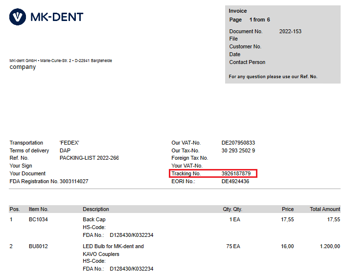 If the shipment was organized through MK-dent all items internationally are sent through FedEx international priority (Schenker for lubrication oil in large quantities) to ensure the fastest possible reception on our end. Kindly note the tracking ID for the shipment will be provided together with the invoice that is sent to you once the parcel has been handed over to FedEx.
